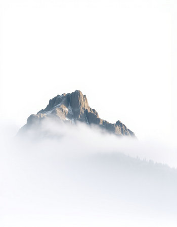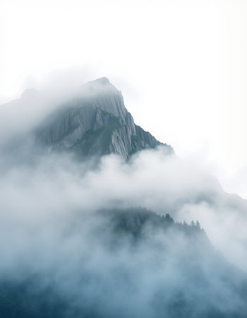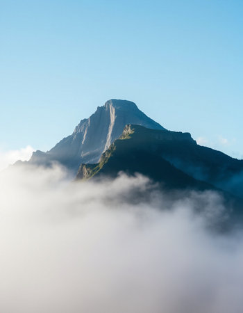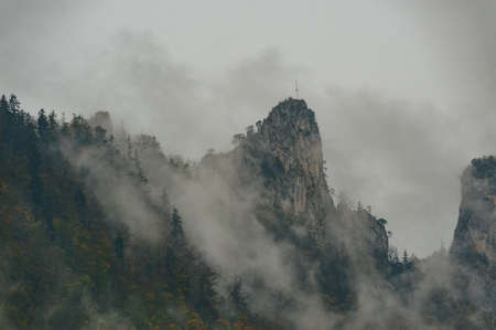 Mountain peak in the clouds. Beautiful mountain landscape in the fog.