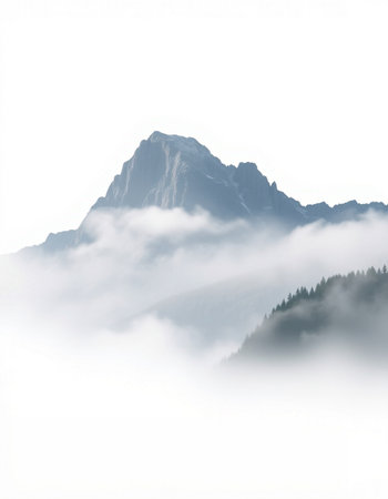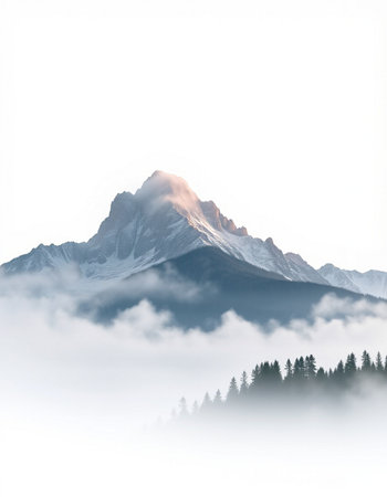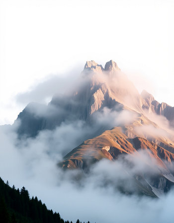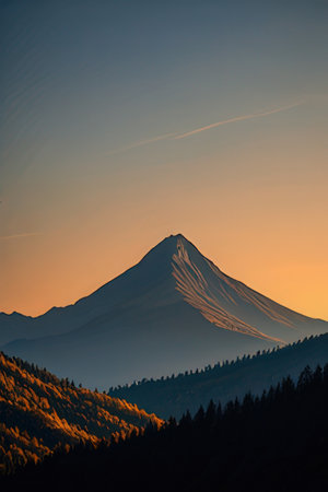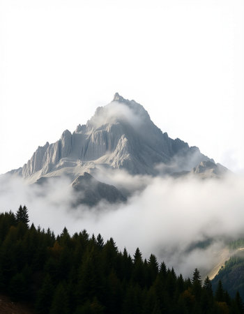 An AI generated illustration of a majestic mountain peak surrounded by lush evergreen trees