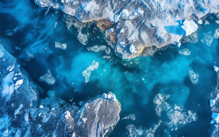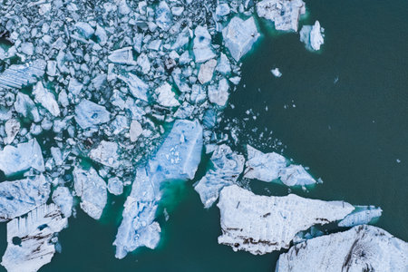 Aerial drone view of floating icebergs in Jokulsarlon glacier lagoon in Iceland, top view