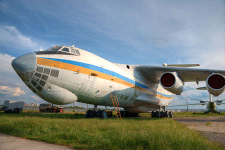 A close-up of an old wrecked passenger plane that has been decommissioned and stands for tourists. The fuselage shows traces of rust and chips. Parts of the metal structure are visible on the wings