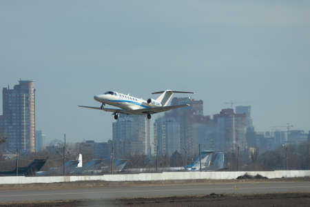 Kiev, Ukraine - March 24, 2011: Cessna 525B Citation Jet CJ3 is taking off from the airport with city on the background