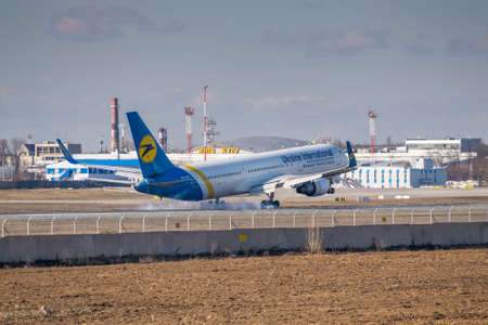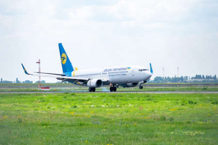 Kyiv Region, Ukraine - August 1, 2018: Ukraine international Airlines Boeing 737 is touching down on landing in the airport