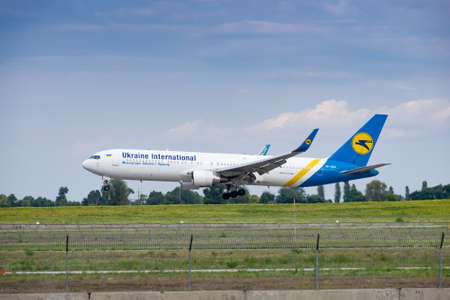 Boryspil, Ukraine - August 3, 2019: Ukraine International Airlines Boeing 767 is langing in the airport