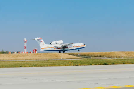Rostov-on-Don, Platov Airport / Russia - 04 October 2019: Russian emergencies Ministry's be-200 amphibious aircraft during training flights at the airport
