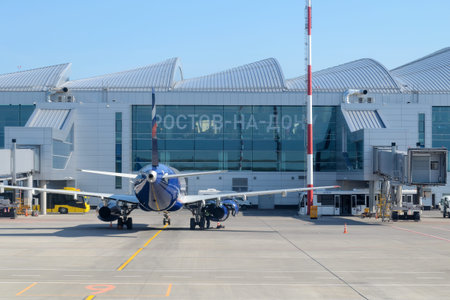 Outside view of the airport building with apron with airplane parked. Russia, Rostov-on-Don, Platov Airport, 2019-04-10