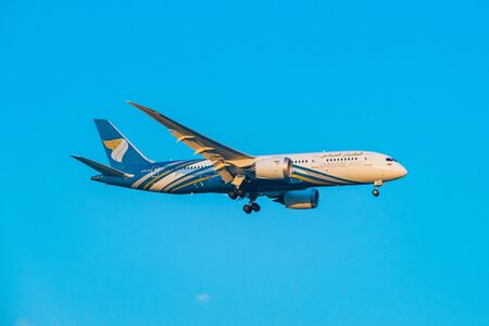 SUVARNABHUMI INTERNATIONAL AIRPORT, BANGKOK, THAILAND - Mar.16, 2018 : Oman Air, Boeing 787 Dreamliner is lined up with the runway and descending for landing.