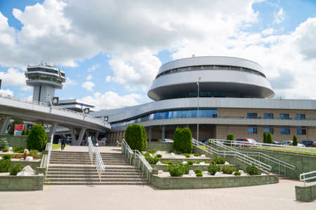Minsk, Belarus - July 08, 2019: Minsk National Airport on a sunny day. Building against the blue sky with clouds.