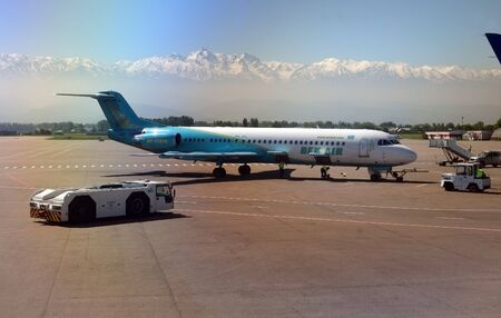 Almaty, Kazakhstan - May 10, 2019: View from the airfield of Almaty on the Zailiyskiy Alatau. Parked Airbus A320 of the largest Kazakhstani air carrier AIR ASTANA.