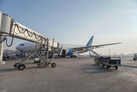 Passenger aircraft at the airport near the terminal. Unloading and loading baggage. Stock photo
