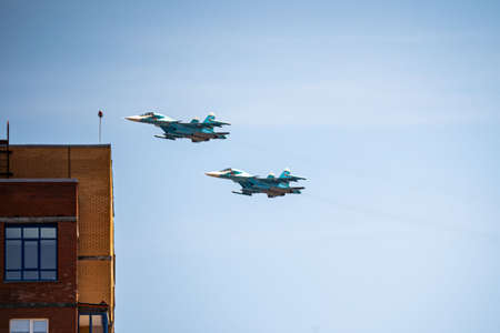 MOSCOW, RUSSIA - May 9, 2021: Group of Russian military supersonic high-altitude interceptors SU-34, SU-35, SU-30SM fast flying close to building during parade