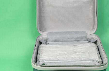 Opened empty, black suitcase for different things on gray background. Travel preparation concept