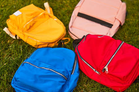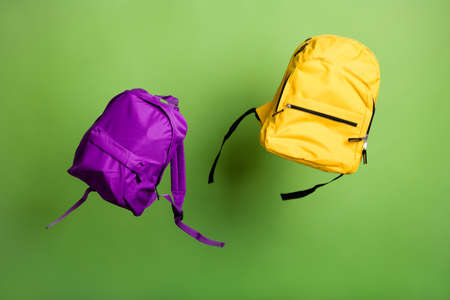Two school back packs modern style sacks thrown up air on green color background season low prices sale concept children stuff equipment