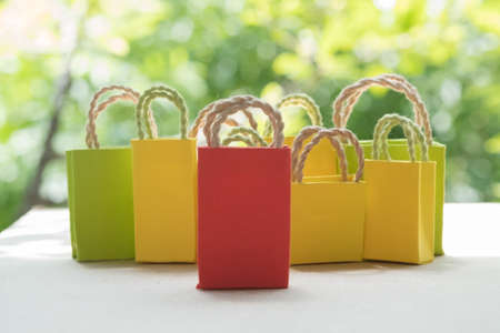 Miniature paper shopping bag with nature green background. Online shopping and delivery service concept.