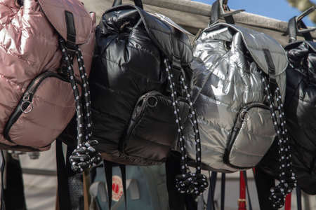 Backpacks and bags, shape and size, on display in a retail store. Backpacks supplies of various manufacturers. in Italy