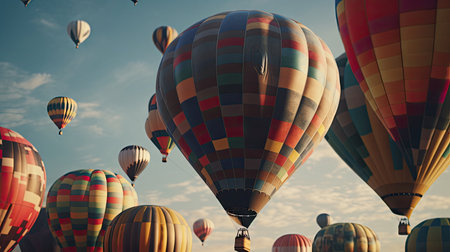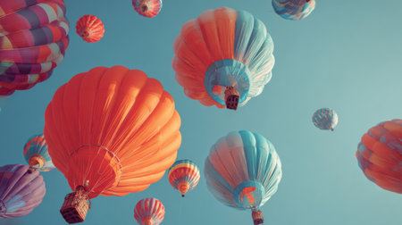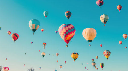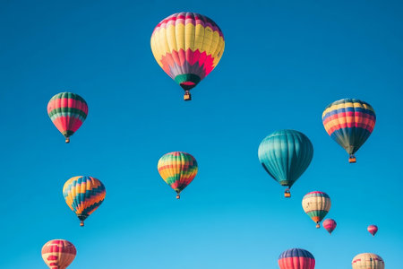 A stunning collection of colorful hot air balloons floats against a clear blue sky, creating a whimsical atmosphere full of adventure and joy perfect for your projects.