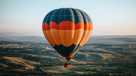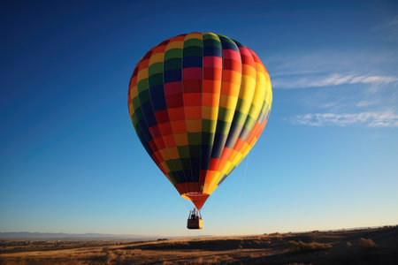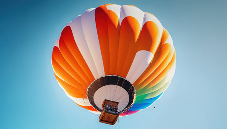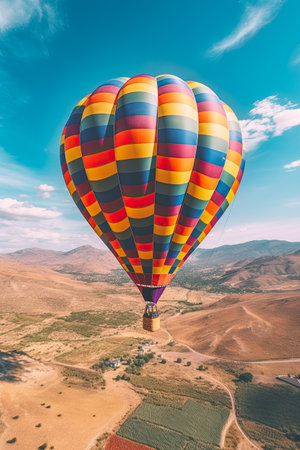 A colorful hot air balloon soaring high in the clear blue sky, offering a serene view of the surrounding landscape. Perfect for adventure and travel themes.