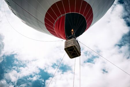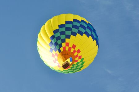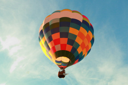 Colorful unbranded hot-air balloon flying in the background of blue sky, low angle picture