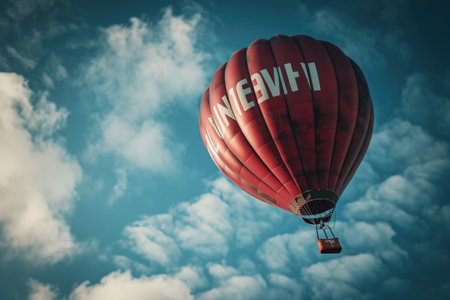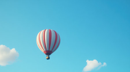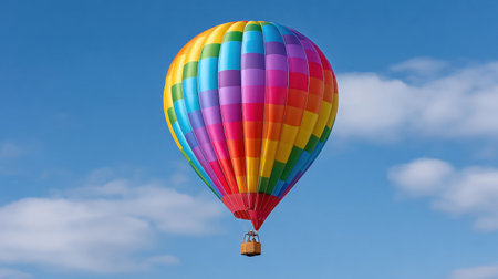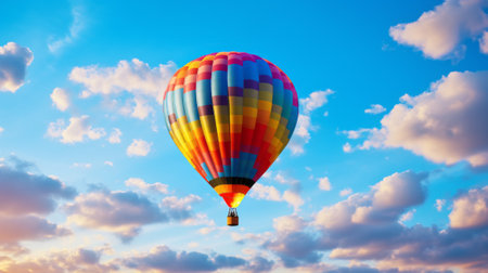 A stunning hot air balloon floats gracefully in the blue sky, surrounded by fluffy clouds. The vibrant colors create a captivating scene ideal for adventure and travel themes.
