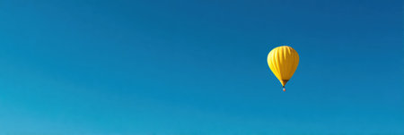 A single yellow balloon floats prominently against a vibrant blue sky backdrop. The balloon's smooth texture contrasts with the clear, cloudless sky. This image captures a sense of lightness and freedom, suitable for various editorial and commercial applications. The composition emphasizes simplicity and visual appeal, offering versatile use.