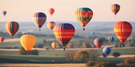 An AI generated illustration of Colorful hot air balloons flying in beautiful scenic sky