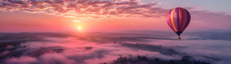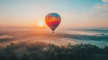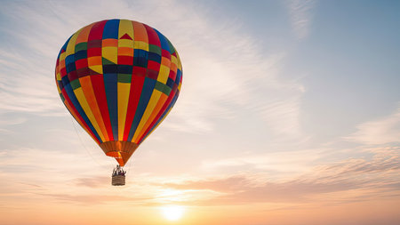 a hot air balloon drifting peacefully over a vast landscape, with the sun rising behind the colorful balloon.