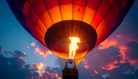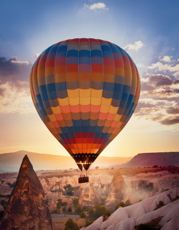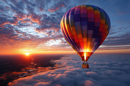 Vibrant hot air balloon soaring through stunning sunset sky with clouds