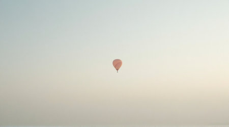 A serene image of a pastel-colored hot air balloon gently floating in a hazy, pale sky at sunrise.