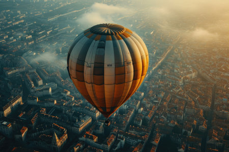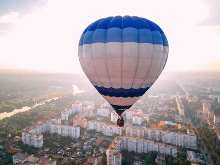 Hot air balloon flying over the city.