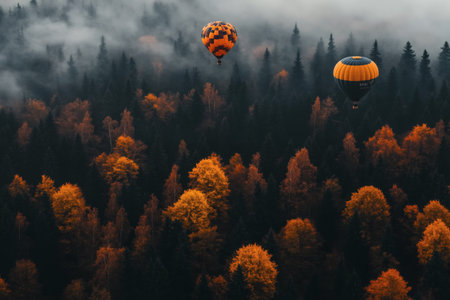Two colorful hot air balloons drift above a dense forest during autumn. The treetops are adorned with vibrant orange and yellow foliage, creating a stunning contrast against the dark green pines and misty sky.