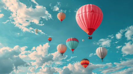 Colorful Hot Air Balloons Soaring High Above Blue Sky Cloudscape Summer up joy view pink teal scene