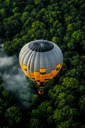 The vibrant hot air balloon drifts peacefully above a lush green forest, surrounded by wisps of fog in the cool morning air, offering stunning views of nature below.