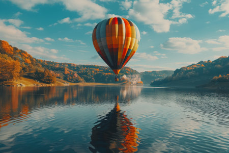 A vibrant hot air balloon floats gracefully over a serene lake, reflecting autumn colors in the calm water, with fluffy clouds scattered across a clear blue sky, creating a picturesque landscape.