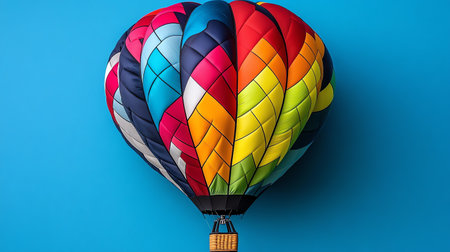 A colorful hot air balloon flying in the sky with a blue background, AI