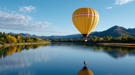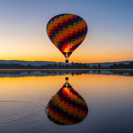 A vibrant hot air balloon floats gracefully over calm lake, reflecting beautifully