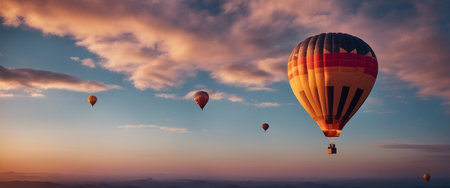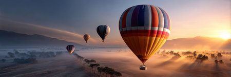 A stunning scene of colorful hot air balloons drifting gracefully in the sky during sunrise. This image captures the beauty of nature and tranquility in flight.