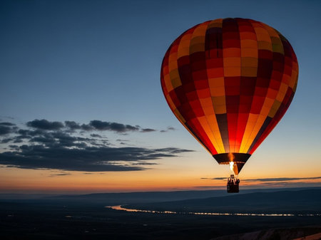 A vibrant hot air balloon floats gracefully over a serene landscape during a stunning sunset, capturing the essence of adventure.