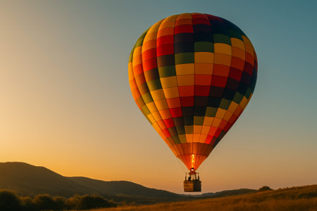 A vibrant hot air balloon gracefully ascends against a golden sunset backdrop in the hills