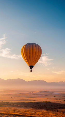Colorful Hot Air Balloon Soaring Over Serene Landscape at Sunrise.