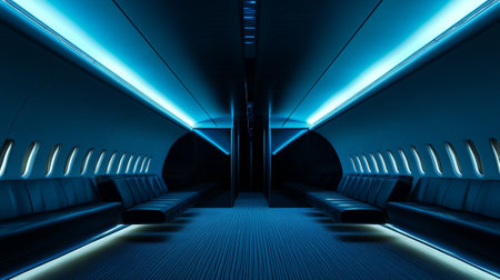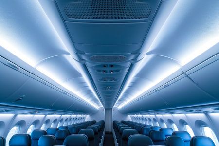 Interior of an empty modern airplane cabin in blue color, Generative AI content