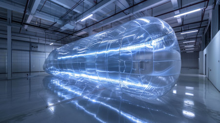 Futuristic Transparent Inflatable Structure in Modern Industrial Warehouse Setting