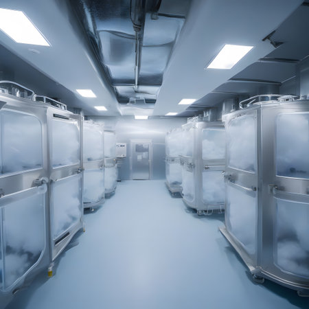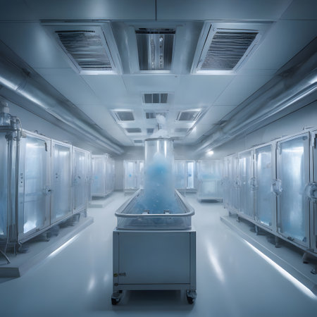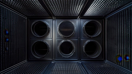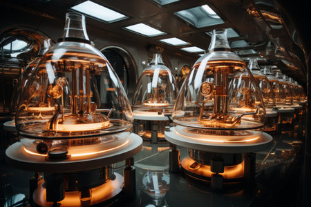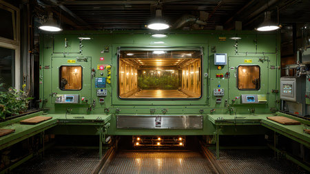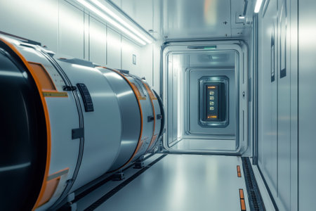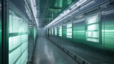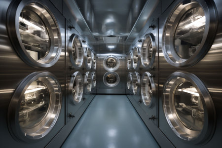A symmetrical view down a clean, metallic corridor of industrial autoclaves, with circular windows reflecting the lights above in a precise and technical environment. High quality photo