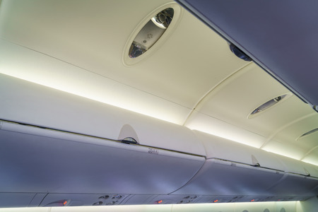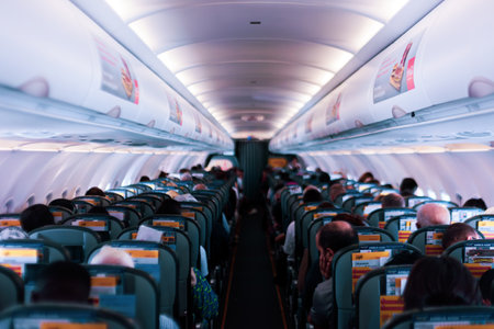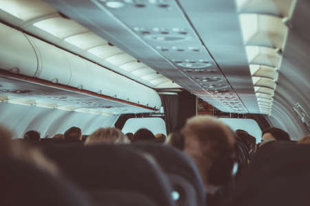Airplane cabin seats with passengers. Economy class of new cheapest low-cost airlines without delay or cancellation of flight. Travel trip to another country.