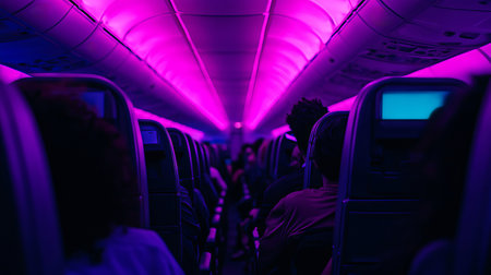 Explore a vibrant and comfortable economy class cabin interior with eco-friendly ambiance. Perfect for modern travel experiences, this image showcases innovative design and stylish lighting that enhances passenger relaxation.