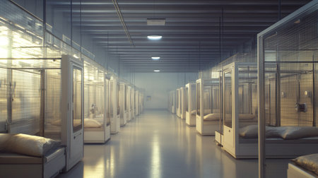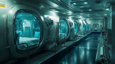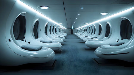 Futuristic capsule sleeping pods in a modern facility with sleek white interiors, soft lighting, and symmetrical arrangement, creating a futuristic and minimalist atmosphere.