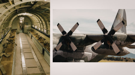 The image shows a close-up view of aircraft propellers inside a hangar, with another section displaying a long, narrow corridor with a tiled floor.