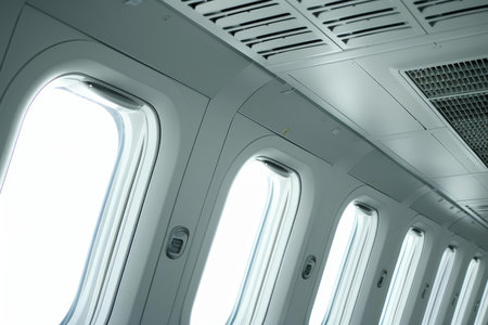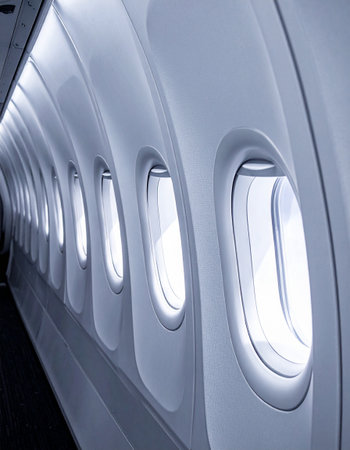 Clean and modern interior of an airplane showing a row of windows with a bright sky outside