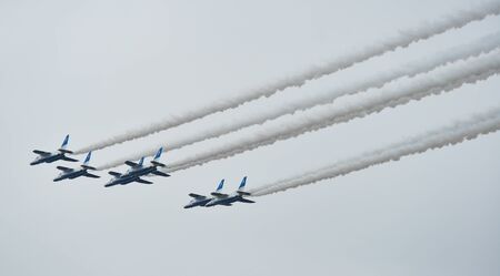 Iruma, Japan - Nov 3, 2019. F-86 Sabres Blue Impulse Aerobatic Demonstration Team of the Japan Air Self-Defense Force (JASDF) flying for display in Iruma Air Base.