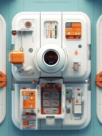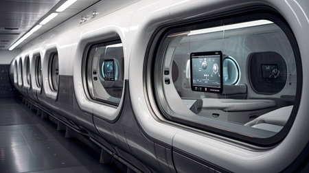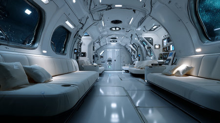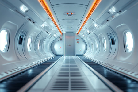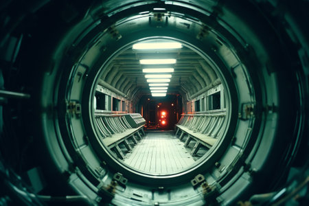 Space station and electronic technology concept. Interior inside the space station. Corridor, portholes and door.