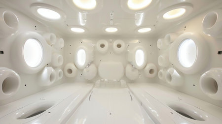 Small spaceship room interior, design of habitat in starship or home on alien planet. Inside futuristic spacecraft, white compartment with bed. Concept of space, technology, future, sci-fi. Generative AI