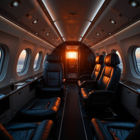 An empty airplane cabin featuring dark leather seats and a modern design. The image captures the minimalistic perspective of travel, evoking a sense of tranquility and anticipation for future journeys